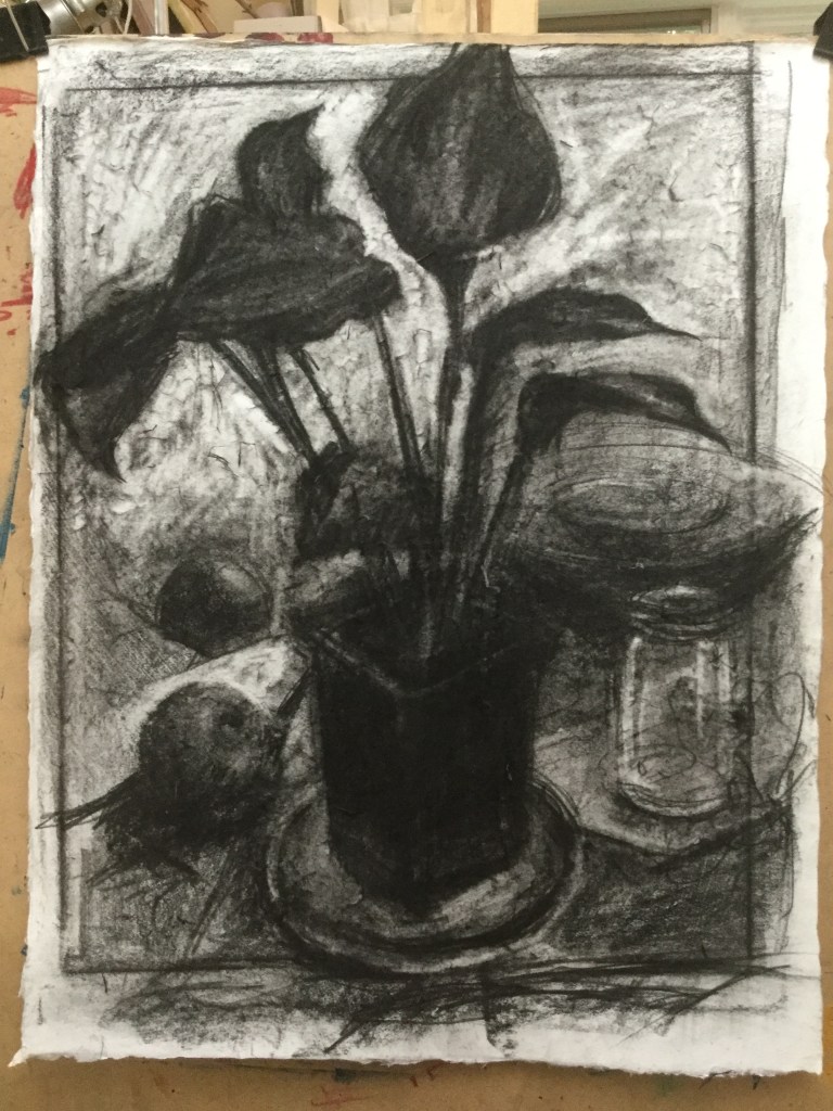Hi dearest artists. An idea for something we could work up to at Wednesday’s drawing in the park. A vigorous, fearless chiaroscuro drawing, starting with a toned paper, then shaping the light negatives with the eraser, and developing things further with some closer observations of contours, composition, middle values, etc. This drawing was changed around a LOT and the paper, way to soft to start with, was shredding away in rolls by the time I got to this point. Perhaps not beautiful, but so much fun, and pleasingly messy…